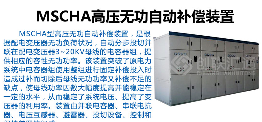 MSCHA型高壓無(wú)功自動(dòng)補(bǔ)償裝置,是根據(jù)配電變壓器無(wú)功負(fù)荷狀況,自動(dòng)分步投切并聯(lián)在配電變壓器3~20kV母線的電容器組,提供相應(yīng)的容性無(wú)功功率。該裝置突破了原電力系統(tǒng)中電容器組使用整組進(jìn)行固定補(bǔ)償投入時(shí)造成過(guò)補(bǔ)而切除后母線無(wú)功功率又補(bǔ)償不足的缺點(diǎn),使母線功率因數(shù)大幅度提高并能穩(wěn)定在一定的水平,從而穩(wěn)定了系統(tǒng)電壓、提高了變壓器的利用率。裝置由并聯(lián)電容器、串聯(lián)電抗器、電壓互感器、避雷器、投切設(shè)備、控制和保護(hù)裝置等組成。