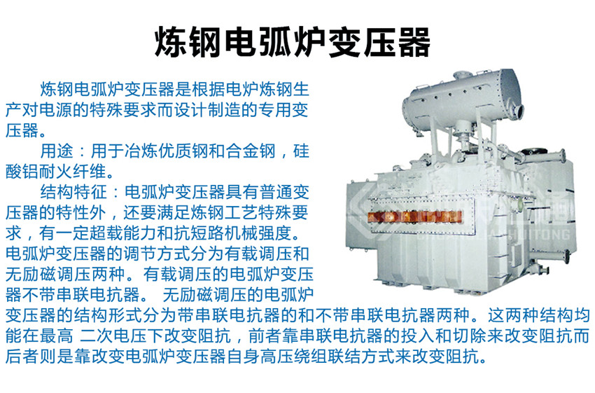 電弧爐變壓器具有普通變壓器的特性外,還要滿足煉鋼工藝特殊要求,有一定超載能力和抗短路機械強度。電弧爐變壓器的調節(jié)方式分為有載調壓無勵磁調壓兩種。有載調壓的電弧爐變壓器不帶串聯(lián)電抗器。 無勵磁調壓的電弧爐變壓器的結構形式分為帶串聯(lián)電抗器的和不帶串聯(lián)電抗器兩種。這兩種結構均能在高 二次電壓下改變阻抗,前者靠串聯(lián)電抗器的投入和切除來改變阻抗,而后者則是靠改變電弧爐變壓器自身高 壓繞組聯(lián)結方式來改變阻抗。